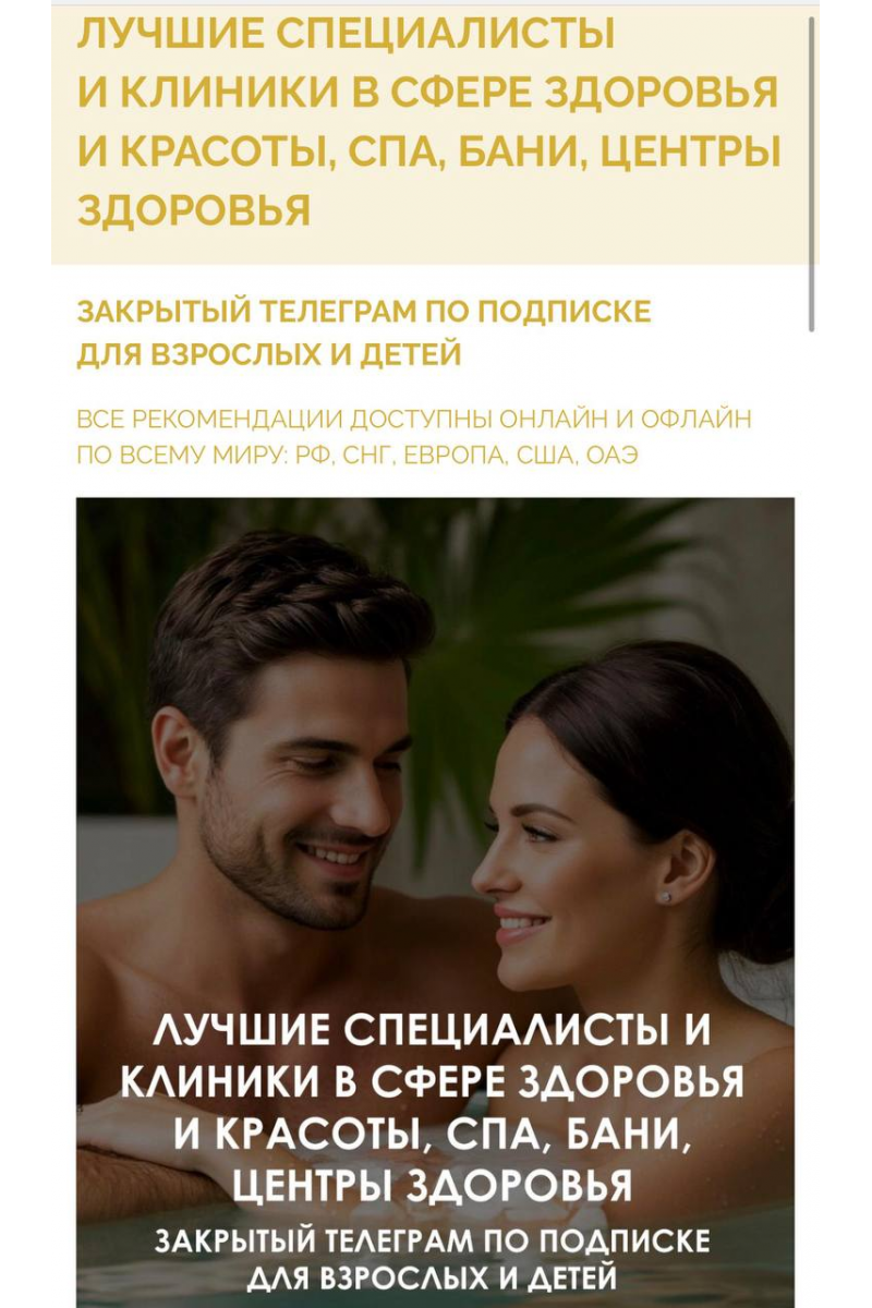 В гайде размещены контакты специалистов, клиник, СПА, бань, центров здоровья, которые мы отбирали с учётом высочайшей экспертности специалистов, безопасности, эффективности, качества процедур и клиентского сервиса