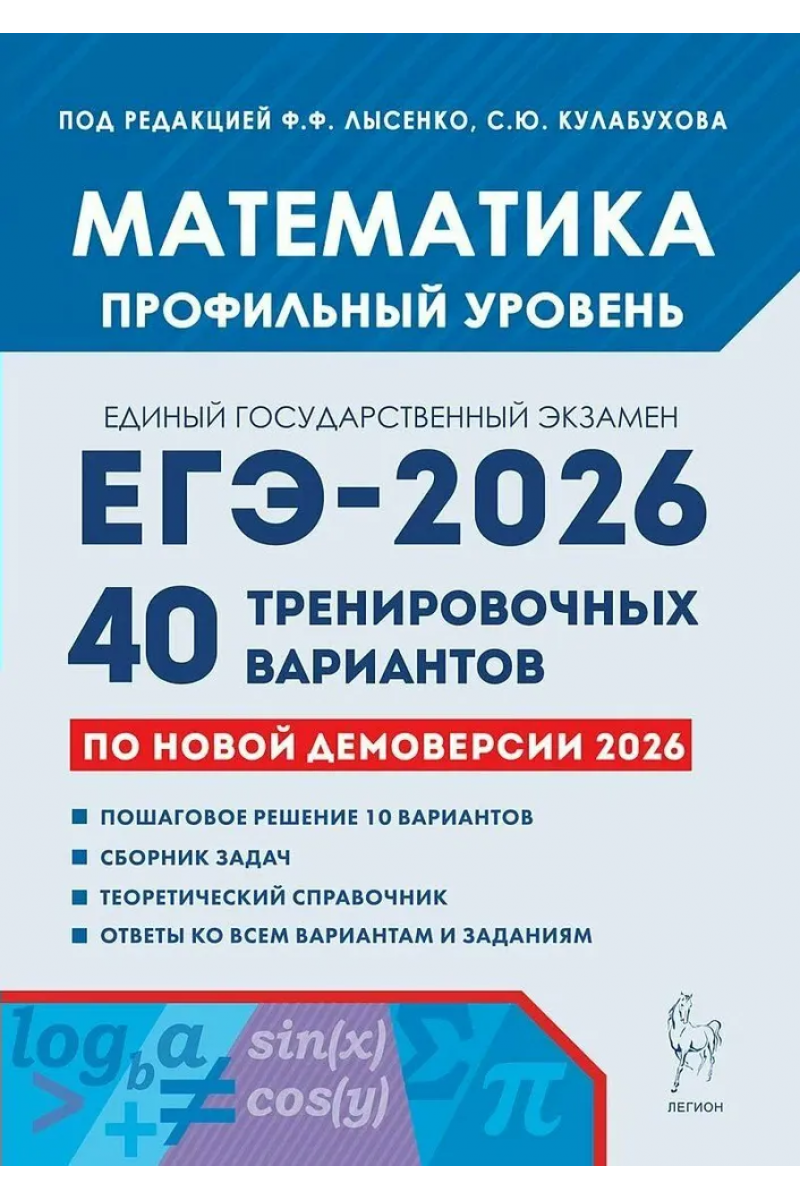 Пособие предназначено для качественной подготовки к профильному уровню ЕГЭ по математике в 2026 году. Оно соответствует демоверсии и спецификации 2026 года. Книга содержит: 40 новых тренировочных вариантов, составленных в соответствии с проектами демоверсии и спецификации 2026 года профильного уровня ЕГЭ по математике, опубликованными на сайте ФИПИ; примеры выполнения 10 вариантов; краткий теоретический справочник; задачник, содержащий основные прототипы задач с кратким ответом; ответы ко всем заданиям и вариантам. Книга адресована старшеклассникам и учителям, готовящим выпускников к экзамену.