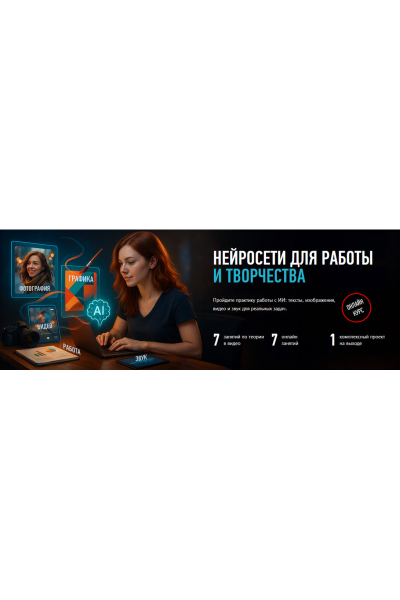 На курсе вы научитесь быстро готовить контент с нейросетями — тексты, изображения, короткие видео и озвучку — и соберёте из него убедительную мультимедийную презентацию.