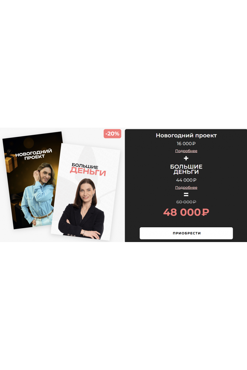 Если вы хотите начать год с ясности, внутренней силы и чётких шагов как измениться, чтобы зарабатывать больше денег — этот дуэт для вас. Фундаментальная программа «Большие деньги» для масштабирования личности и карьеры. А новогодняя программа поможет вдохнуть волшебное и создаст пространство для чуда.