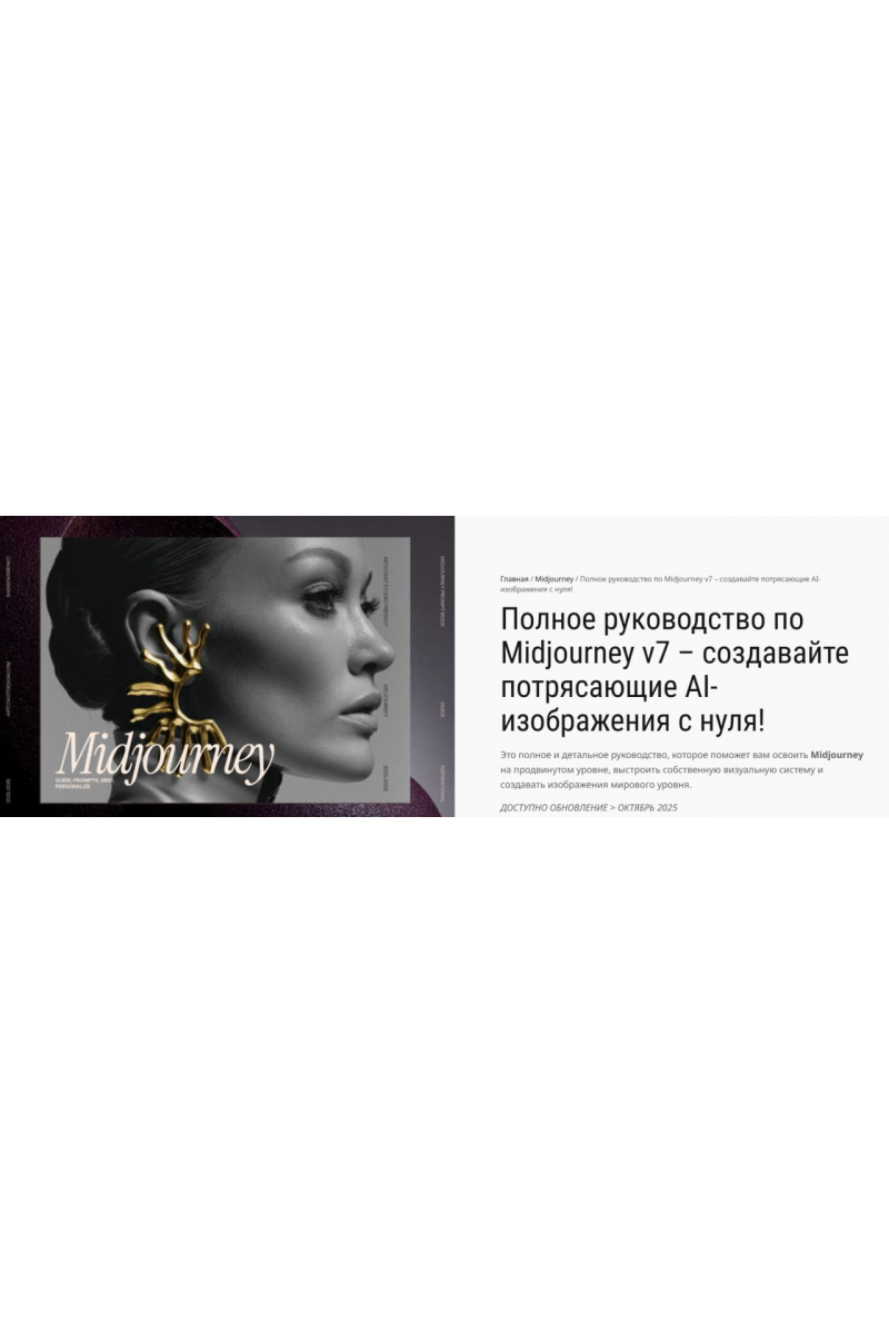 Вы получаете обучающий материал для самостоятельного изучения, который шаг за шагом проведёт вас через весь процесс работы с Midjourney — от базовых принципов до профессиональных приёмов.