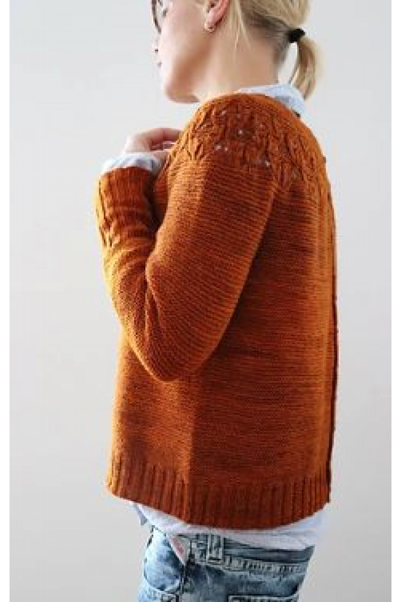 Вяжется платочной вязкой сверху вниз, спинка украшена симпатичными пуговицами. Сначала вяжется несколько коротких рядов взад и вперед, чтобы сделать вырез на спине повыше, а затем вяжется кокетка сверху вниз до разделения рукавов. Вяжется несколько последних коротких рядов, чтобы завершить формирование кокетки, а затем петли рукавов откладываются, и вяжется основная часть до резинки. Рукава вяжутся сверху вниз до манжет. Дополнительная отделка не требуется.