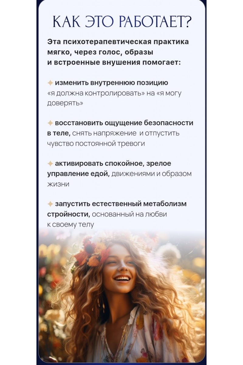 Эта психотерапевтическая практика мягко, через голос, образы и встроенные внушения помогает: