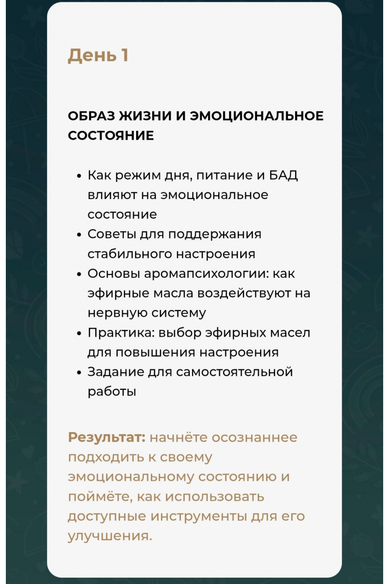 Результат: начнёте осознаннее подходить к своему эмоциональному состоянию и поймёте, как использовать доступные инструменты для его улучшения.