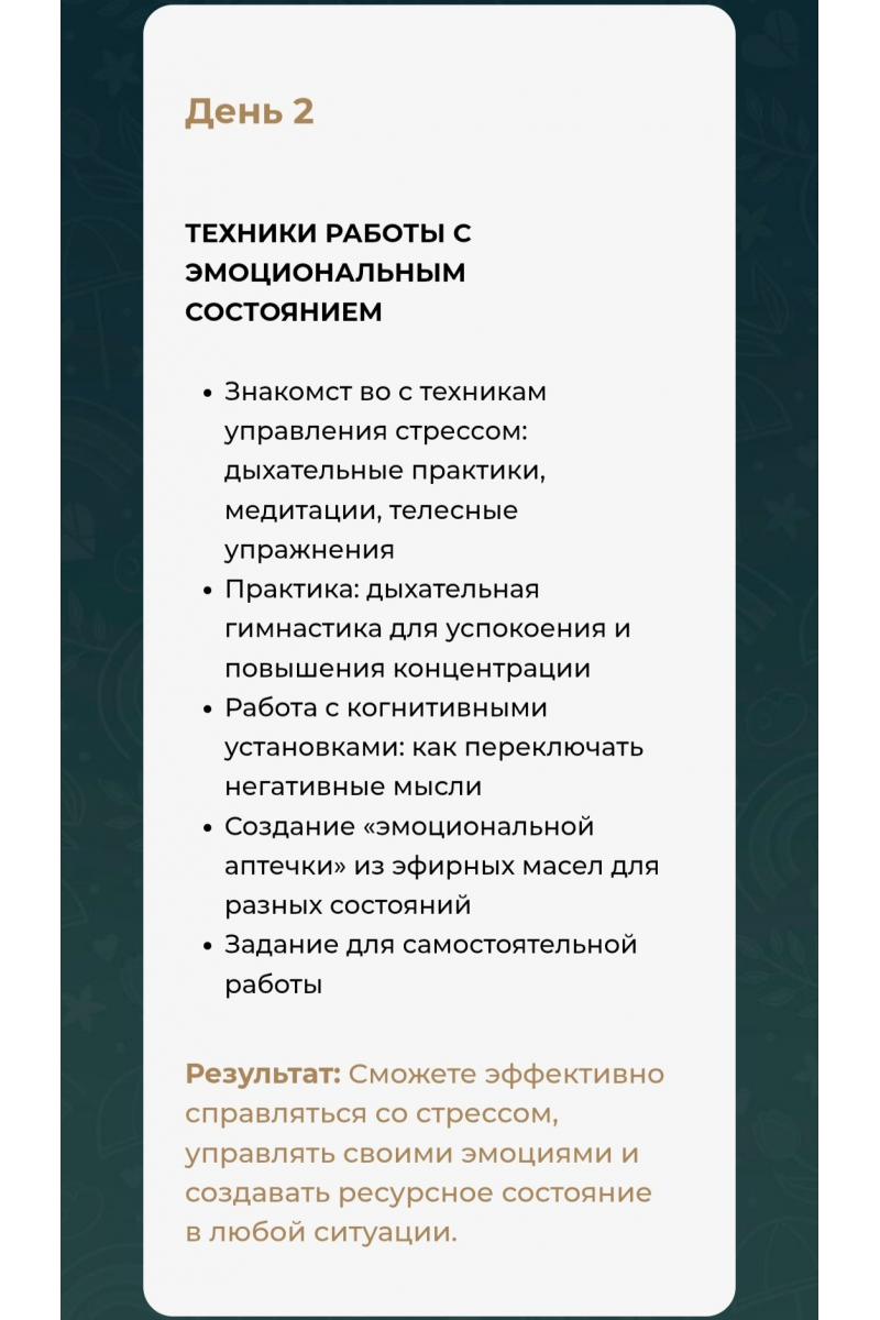 Результат: Сможете эффективно справляться со стрессом, управлять своими эмоциями и создавать ресурсное состояние в любой ситуации.
