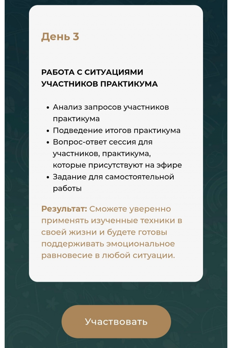 Третий день, посвящённый разбору примеров из жизни участников, делает практикум уникальным. Вы сможете получить персональные рекомендации от экспертов и увидеть, как решения применяются на практике. - Возможность выбраться из эмоциональной ямы
